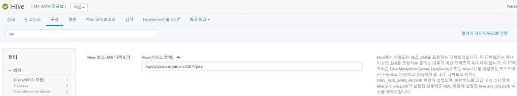 나의 경우는 hive hcatalog가 이미 설치가 돼있고, /opt/cloudera/parcels/CDH/jars 디렉토리에 라이브러리가 있었다. 설정 후 hive 관련 서비스를 재시작해주면 된다. 그리고 hive에서 json 포맷이 잘 불러와지는지 확인하면 된다.